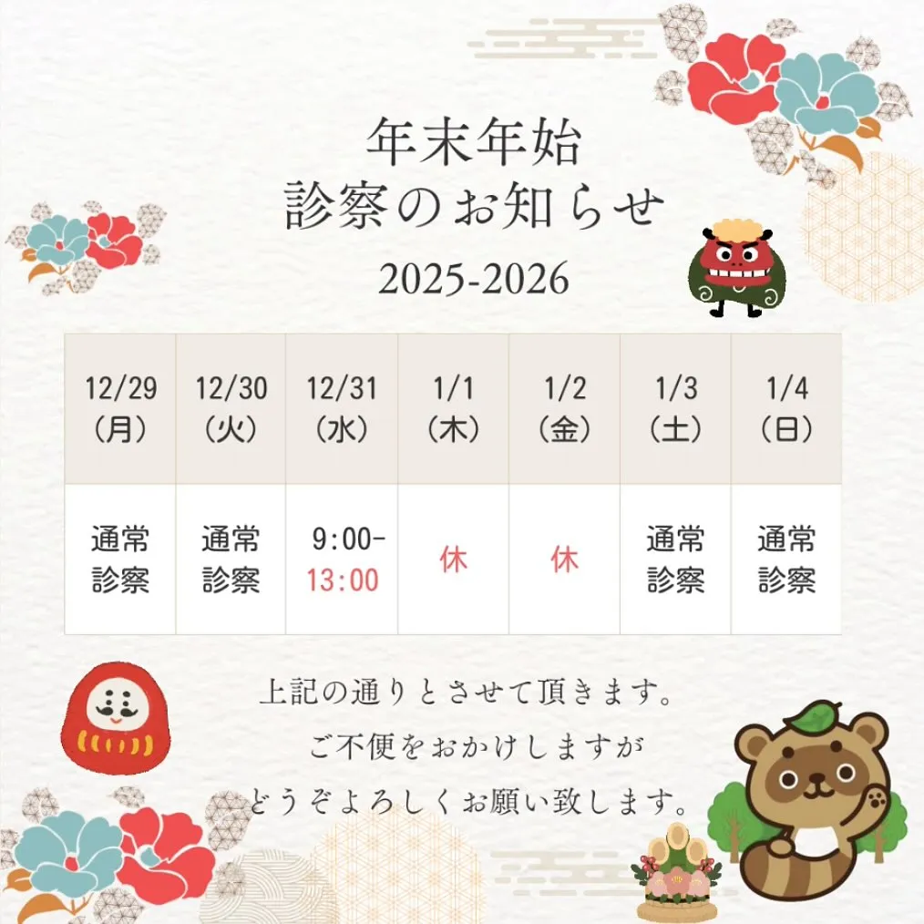 1/1(木)、1/2(金)は休診日とさせて頂きます!